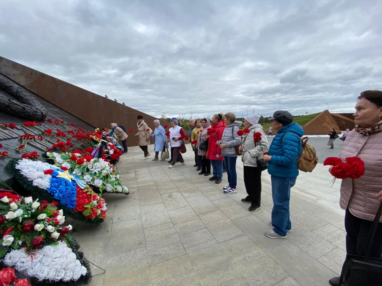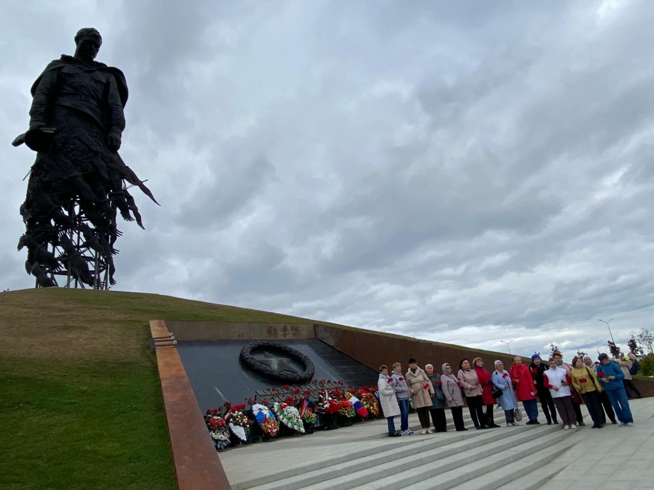 Ветераны побывали в Мемориальном комплексе в память обо всех солдатах Великой Отечественной войны, который возведен на месте кровопролитных боев подо Ржевом 1942-1943гг. Мемориал создан по инициативе ветеранов Великой Отечественной войны, тех, кто воевал здесь, кто удержал и обескровил силы гитлеровской группы армий «Центр». Он представляет собой 25-метровую фигуру солдата, возвышающуюся над коридором стальных плит, на которых увековечены имена павших воинов. Постоянно играющая музыка – торжественная, скорбная. Монумент производит сильное впечатление. Безусловно, размер и идея монумента вызывают волнение уже тогда, когда видишь его издалека. Но самые яркие чувства ждут каждого, кто подойдет ближе. Подходя к монументу, достигаешь точки, стоя на которой встречаешься взглядом с СОЛДАТОМ… Мир останавливается… Сколько тоски, скорби, боли и, одновременно, умиротворения и надежды выражают глаза Советского Солдата. Сильное впечатление. В это время в голове звучат слова из песни Яна Френкеля «Журавли».